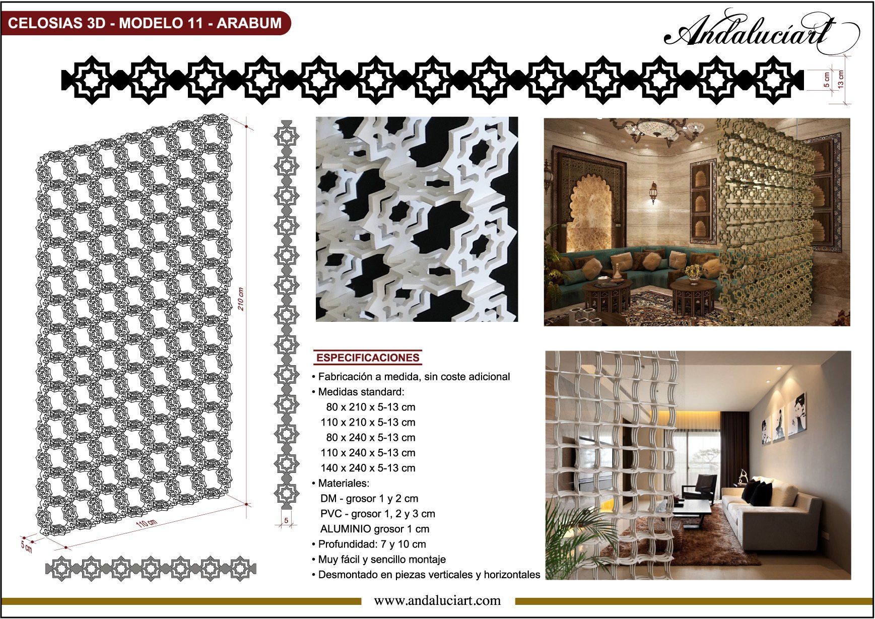 En Andaluciart® Celosías y Tallados le ofrecemos una gran variedad de modelos, que usted puede solicitar EN CUALQUIER MEDIDA QUE NECESITE y sobre los diferentes materiales que fabricamos los paneles decorativos de celosías, separadores de ambientes (madera, DM, PVC, metacrilato, aluminio, acero, celosías de latón, bronce, mármol, granito, y celosías de vinilo).