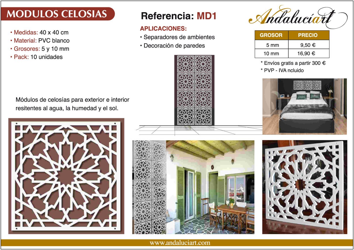 El material más adecuado y económico para interior es el MDF en acabado pintado en color del catálogo RAL, para exterior los dos materiales más utilizados son el PVC y el aluminio con acabados pintados. Solicite cotización de presupuesto a nuestro departamento comercial, que le recomienda siempre la mejor opción en la fabricación de celositas.