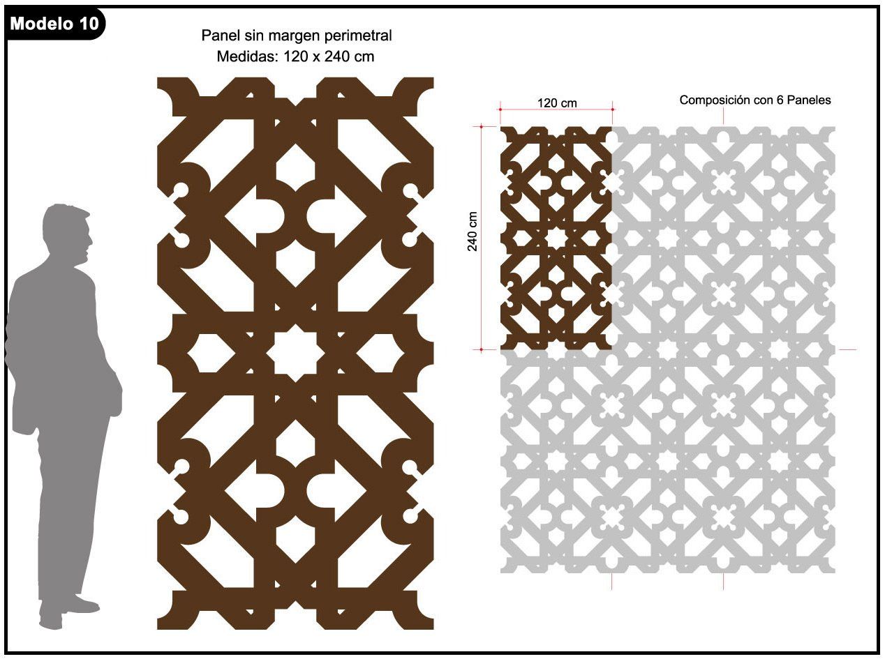 En Andaluciart® Celosías y Tallados le ofrecemos una gran variedad de modelos, que usted puede solicitar EN CUALQUIER MEDIDA QUE NECESITE y sobre los diferentes materiales que fabricamos los paneles decorativos de celosías, separadores de ambientes (madera, DM, PVC, metacrilato, aluminio, acero, celosías de latón, bronce, mármol, granito, y celosías de vinilo).