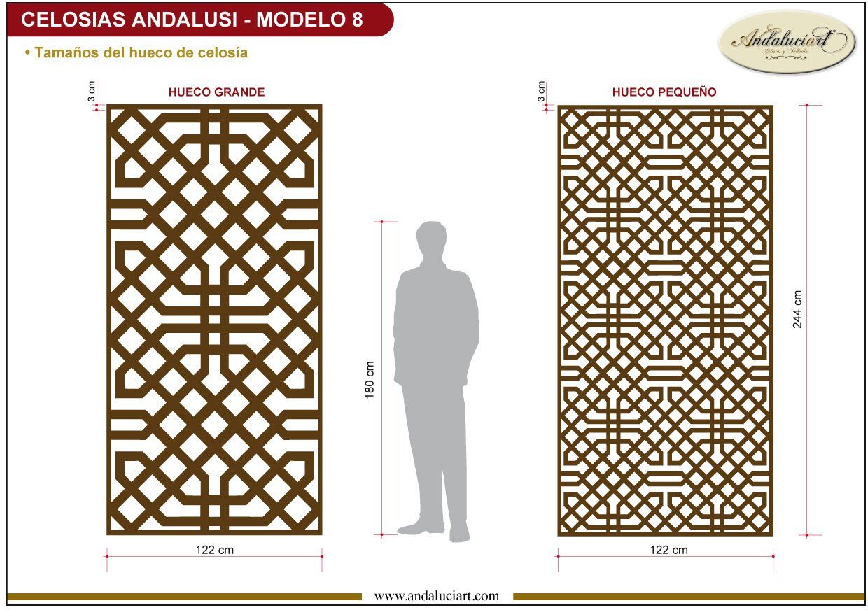 En Andaluciart® Celosías y Tallados le ofrecemos una gran variedad de modelos, que usted puede solicitar EN CUALQUIER MEDIDA QUE NECESITE y sobre los diferentes materiales que fabricamos los paneles decorativos de celosías, separadores de ambientes (madera, DM, PVC, metacrilato, aluminio, acero, celosías de latón, bronce, mármol, granito, y celosías de vinilo).
